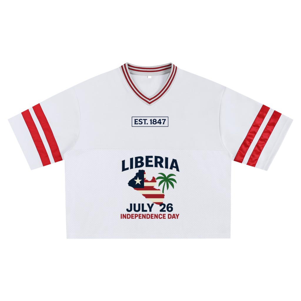 This Jū Juli limited-edition Taped Mesh Boxy T-Shirt is designed to honor Liberia’s 178th Independence Day in true culture-meets-style fashion. Featuring a relaxed oversized fit with a breathable mesh bottom panel, this piece delivers both comfort and statement power.