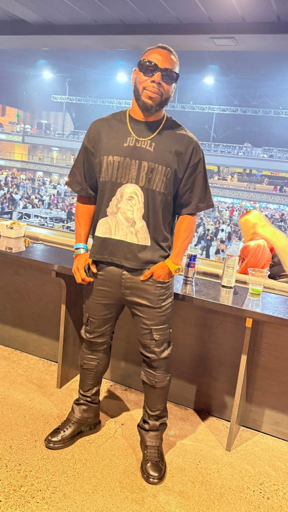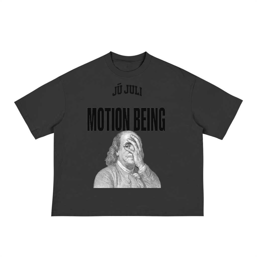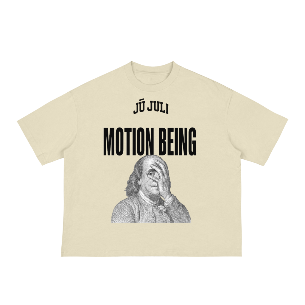 Step into the spotlight with the Jū Juli “Motion Being” oversized tee — where style meets meaning. Featuring a bold graphic of Benjamin Franklin covering his face, this design captures the energy of hustle, resilience, and silent ambition.