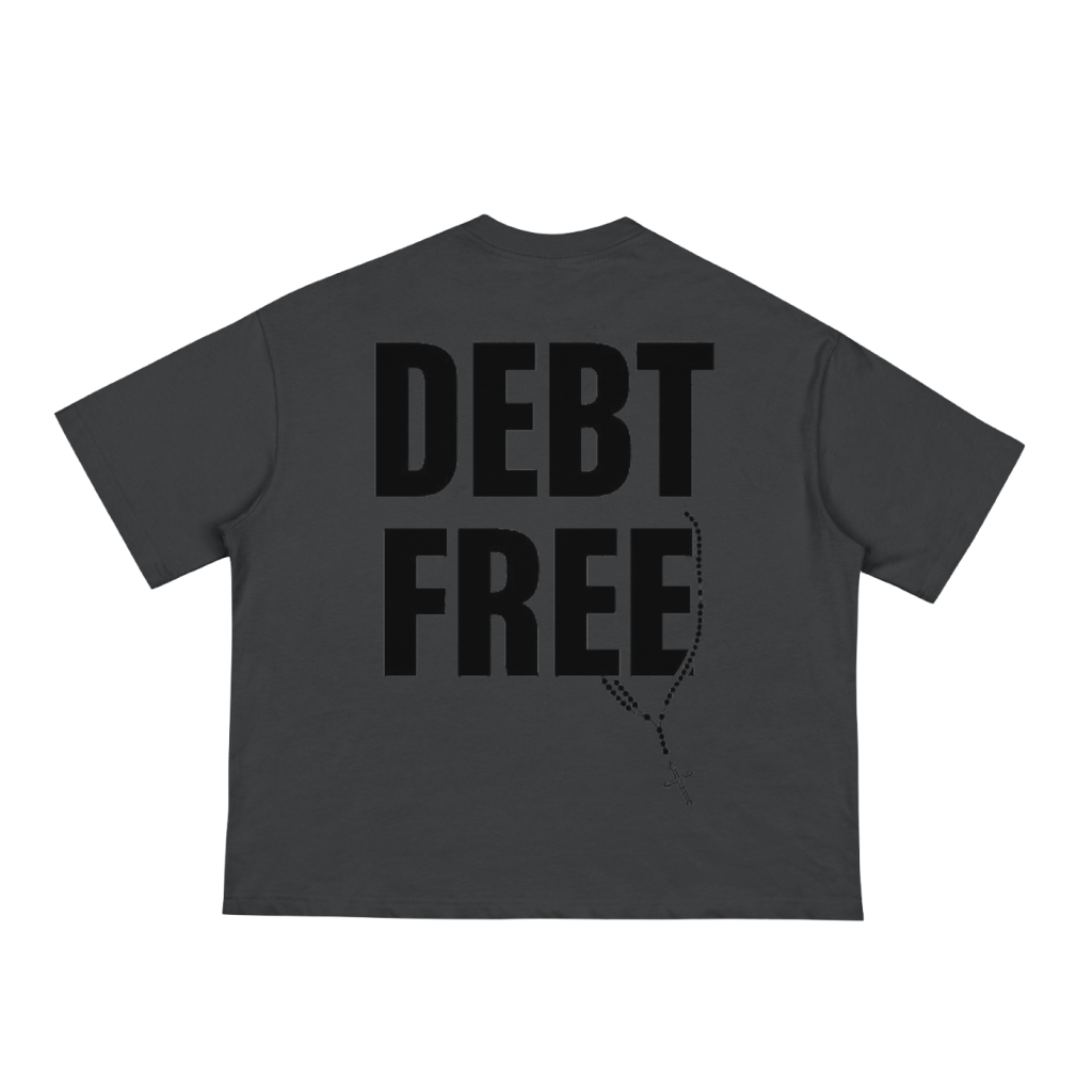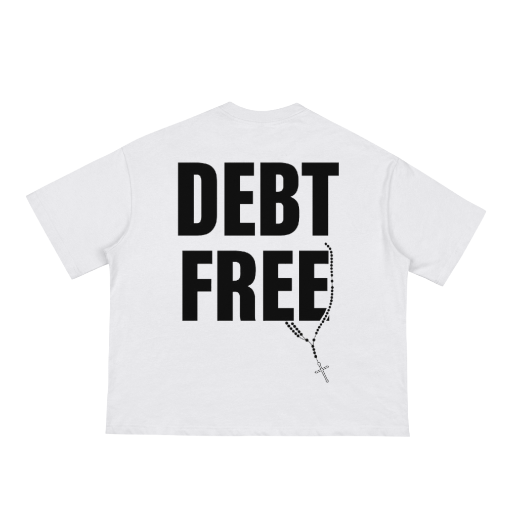 On the back, “DEBT FREE” with a symbolic rosary graphic speaks to financial freedom, faith, and fearless living.