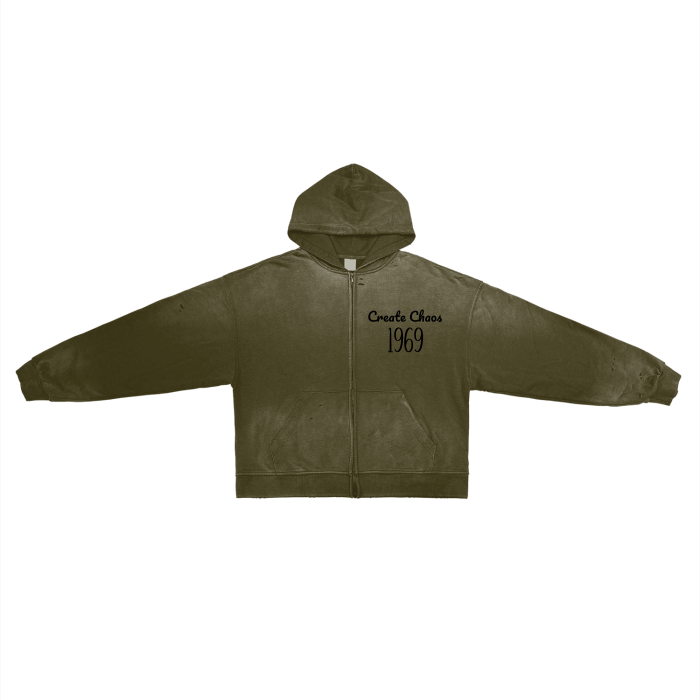 Unleash raw energy with the Create Chaos 1969 Zip Hoodie, a bold statement piece that embodies a post-apocalyptic aesthetic. Crafted from 100% pure cotton, this hoodie is hand-frayed and monkey-washed for an authentically distressed, lived-in look. The rugged textures and meticulous detailing pay homage to rebellion and resilience, while the phrase “Create Chaos 1969” serves as a nod to a revolutionary spirit.