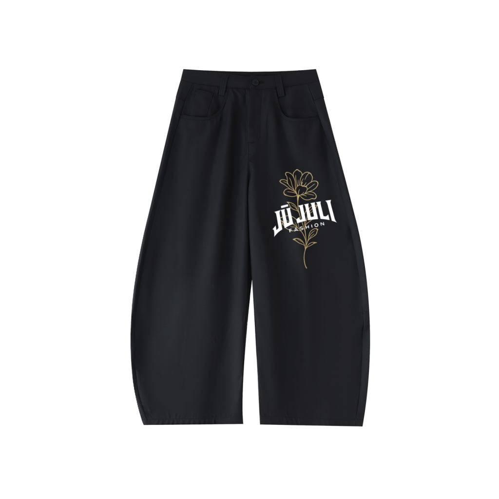 The barrel pants add structure and modern edge, with a rounded architectural leg that elevates the entire look into high-fashion territory while still feeling effortless.